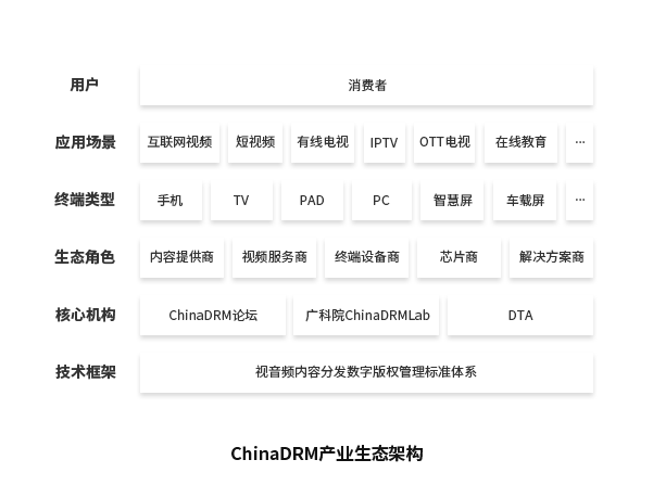 ChinaDRM产业体系建设重点包括:自主创新技术标准、中国企业主导的产品和解决方案、产业运行规则和合作模式、产业公共服务能力等要素。其中技术标准体系以《视音频内容分发数字版权管理技术规范》(GY/T 277-2019)为核心、以《视音频内容分发数字版权管理标准体系》(广电办发〔2021〕45号)为框架。产业运行规则以“DTA系列许可协议”为框架,包含信任管理、安全评估、服务认证等机制方案。